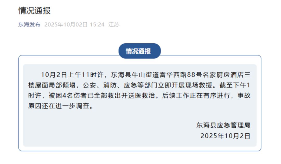10月2日上午11时许,东海县牛山街道富华西路88号名家厨房酒店三楼屋面局部倾塌,公安、消防、应急等部门立即开展现场救援。截至下午1时许,被困4名伤者已全部救出并送医救治。后续工作正在有序进行,事故原因还在进一步调查。